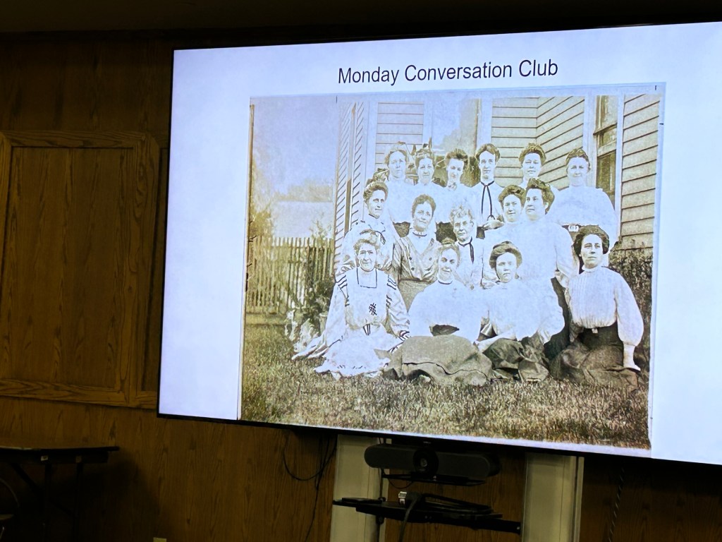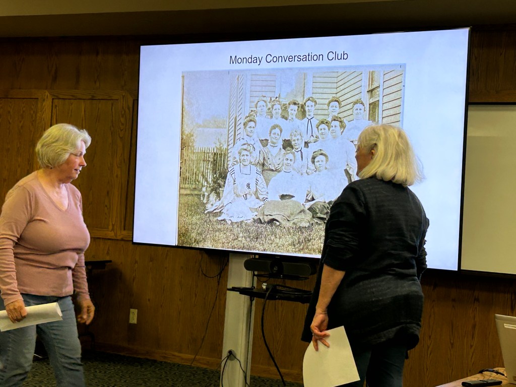 At the May 17, 2023 meeting, Sue Bratton and Sarah Evans gave a presentation of the history of the Monday Conversation Club, which celebrated its 125th year of existence.